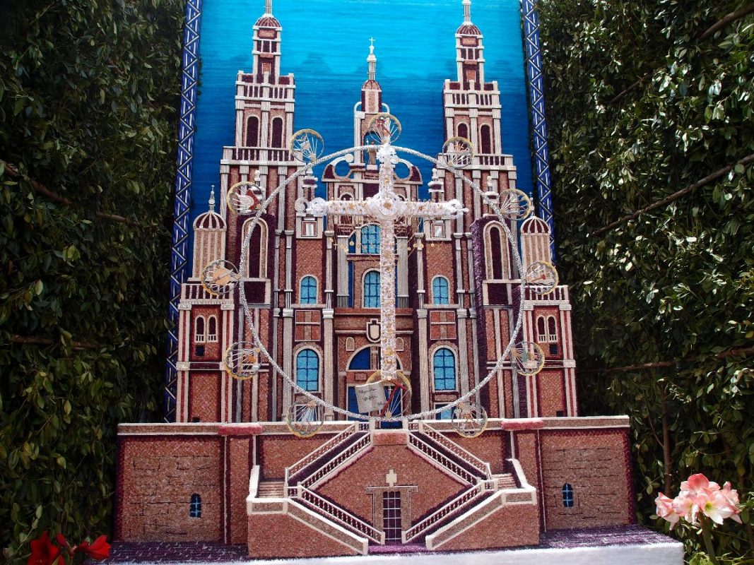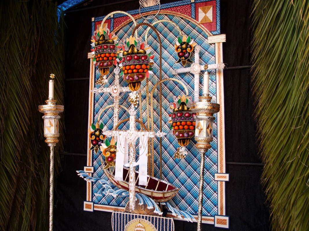 Zentraler Mittelpunkt bleibt das Kreuz, das möglichst einen schwebenden Eindruck vermitteln soll. Geschmückt mit echtem Goldschmuck aus den Schatzkästchen der Nachbarn, der dann rund um die Uhr auch im Auge behalten werden muss.